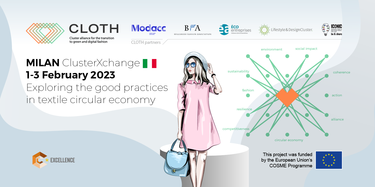 26 January 2023 – Ruse / Copenhagen / Aix-en-Provence / Barcelona / Iasi : CLOTH Project, the european alliance which brings together individuals, companies and clusters working on the transformation of the fashion sector towards sustainability and digital is announcing the latest information about its ClusterXchange event in Milan, Italy. It will take place from 1st to 3rd February 2023 and will include a visit to Milano Unica, the international top-end textile fair and Raffles Milano – a fashion school with a non-traditional spirit and method that has gathered around it a formidable team of teachers, in many cases leading names on the international style and design scene.